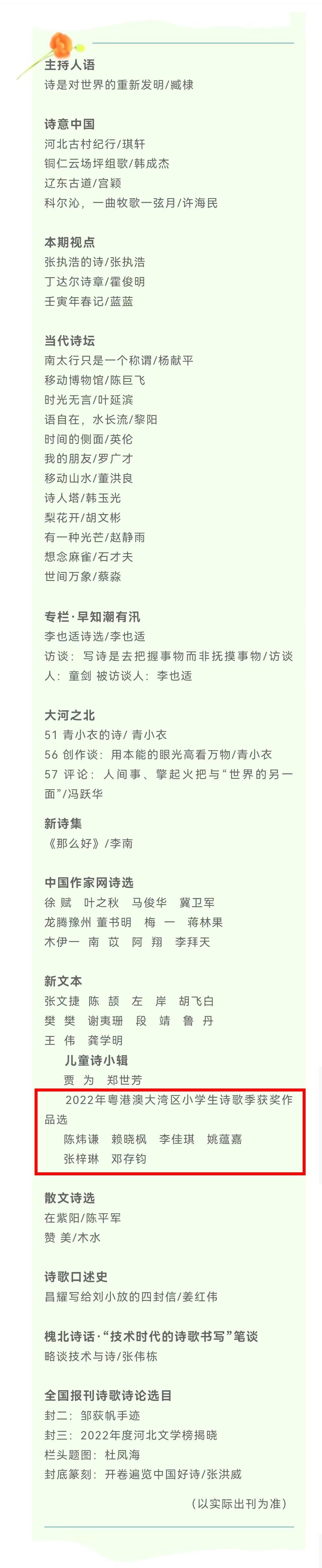 继2021年粤港澳大湾区小学生诗歌季11首获奖作品被巨擘诗歌刊物《诗选刊》选登之后,近日《诗选刊》2023年06期再次采取了6首2022年粤港澳大湾区小学生诗歌季独特奖作品!